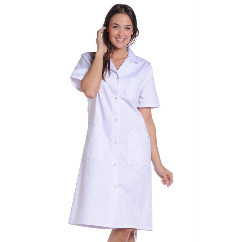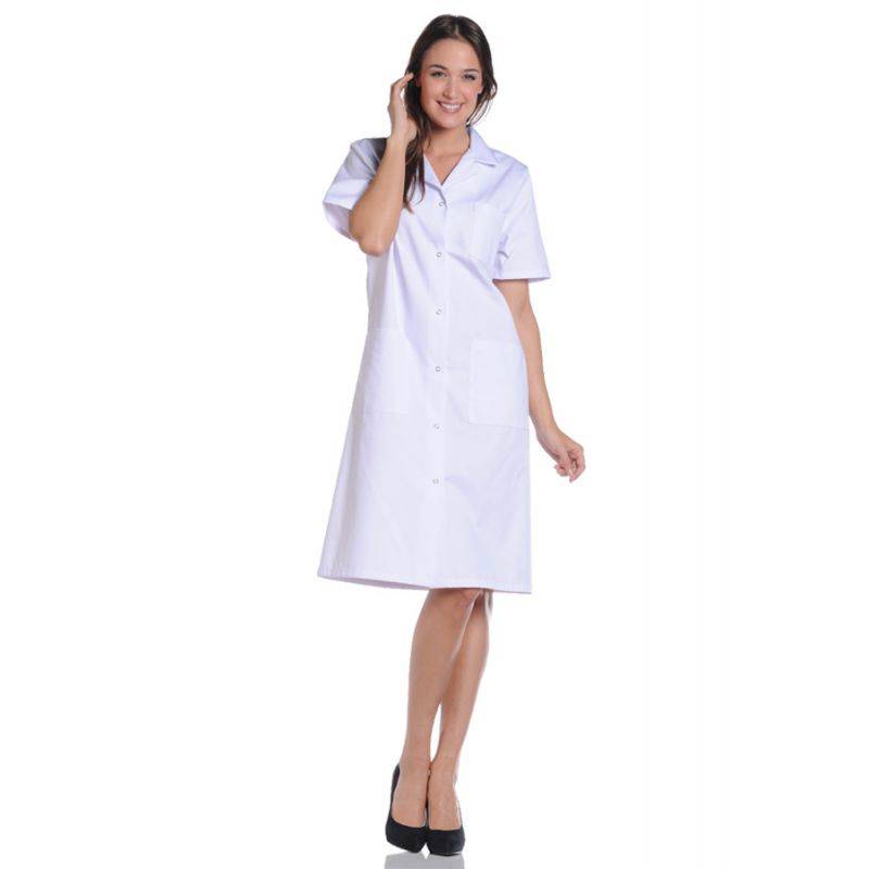Cette blouse de travail blanche GALA en polycoton à manches courtes a une longueur de 105 cm et est très confortable et agréable à porter