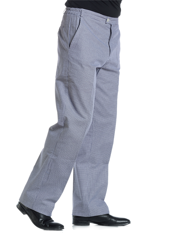 Pantalon de cuisine. Pied de poule. Poches italiennes. Élastiques de souplesse sur les côtés. Ceinture bouton et braguette boutonnée. Poche arrière passepoilée et boutonnée.